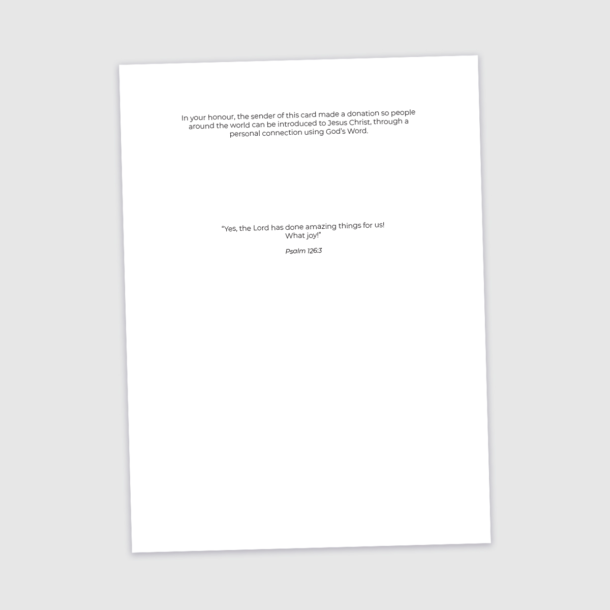 You can dedicate your gift to ShareWord Global by donating in memory of or in honour of a loved one. When you give, you’re also sharing the love of Christ by placing copies of God’s Word in the hands of people around the world.