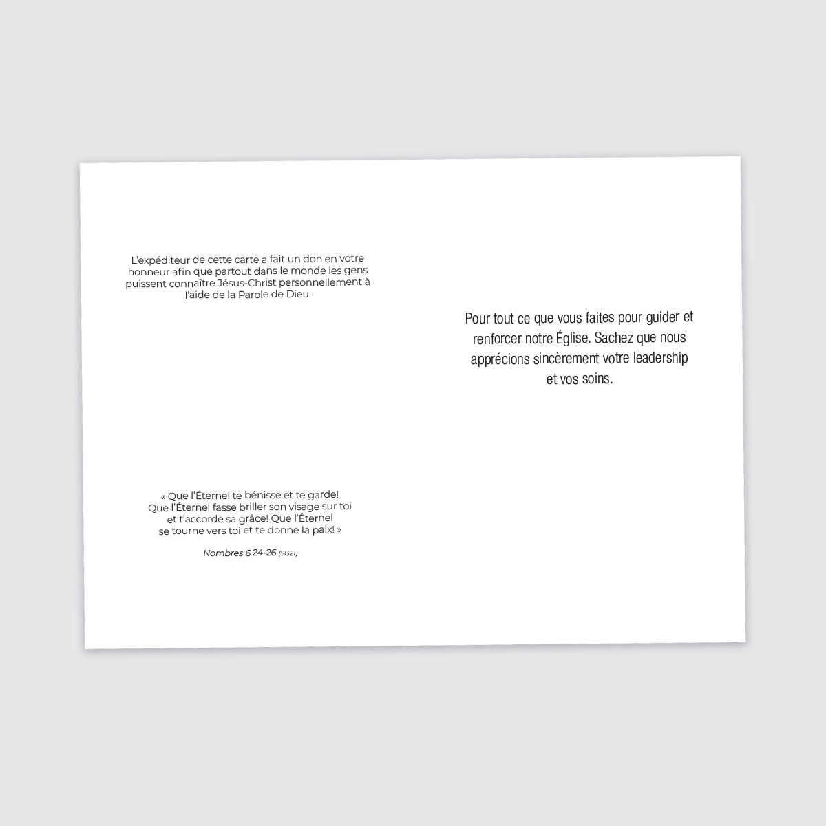 Pour tout ce que vous faites pour guider et renforcer notre Église. Sachez que nous apprécions sincèrement votre leadership et vos soins.