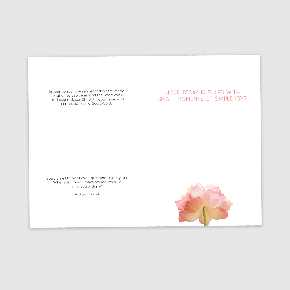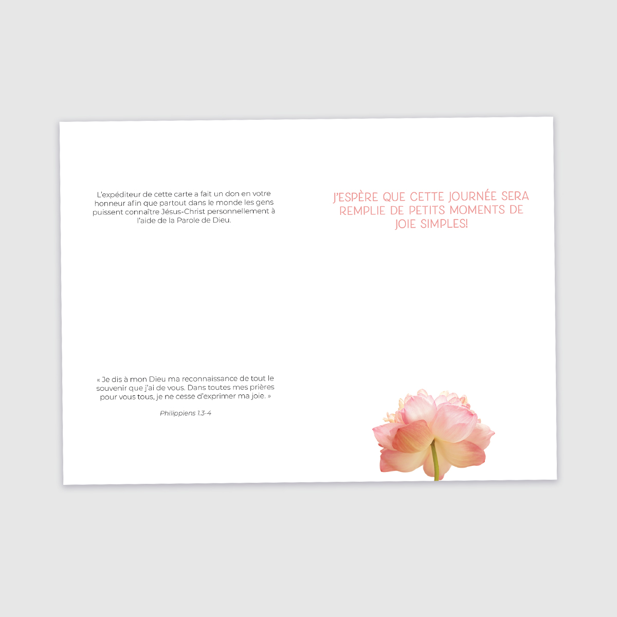 « Je dis à mon Dieu ma reconnaissance de tout le souvenir que j’ai de vous. Dans toutes mes prières pour vous tous, je ne cesse d’exprimer ma joie. » - Philippiens 1.3-4