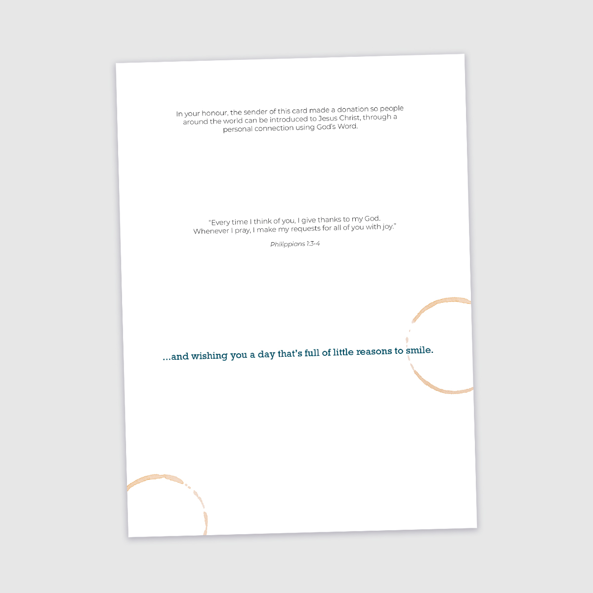 « Je dis à mon Dieu ma reconnaissance de tout le souvenir que j’ai de vous. Dans toutes mes prières pour vous tous, je ne cesse d’exprimer ma joie. » - Philippiens 1.3-4