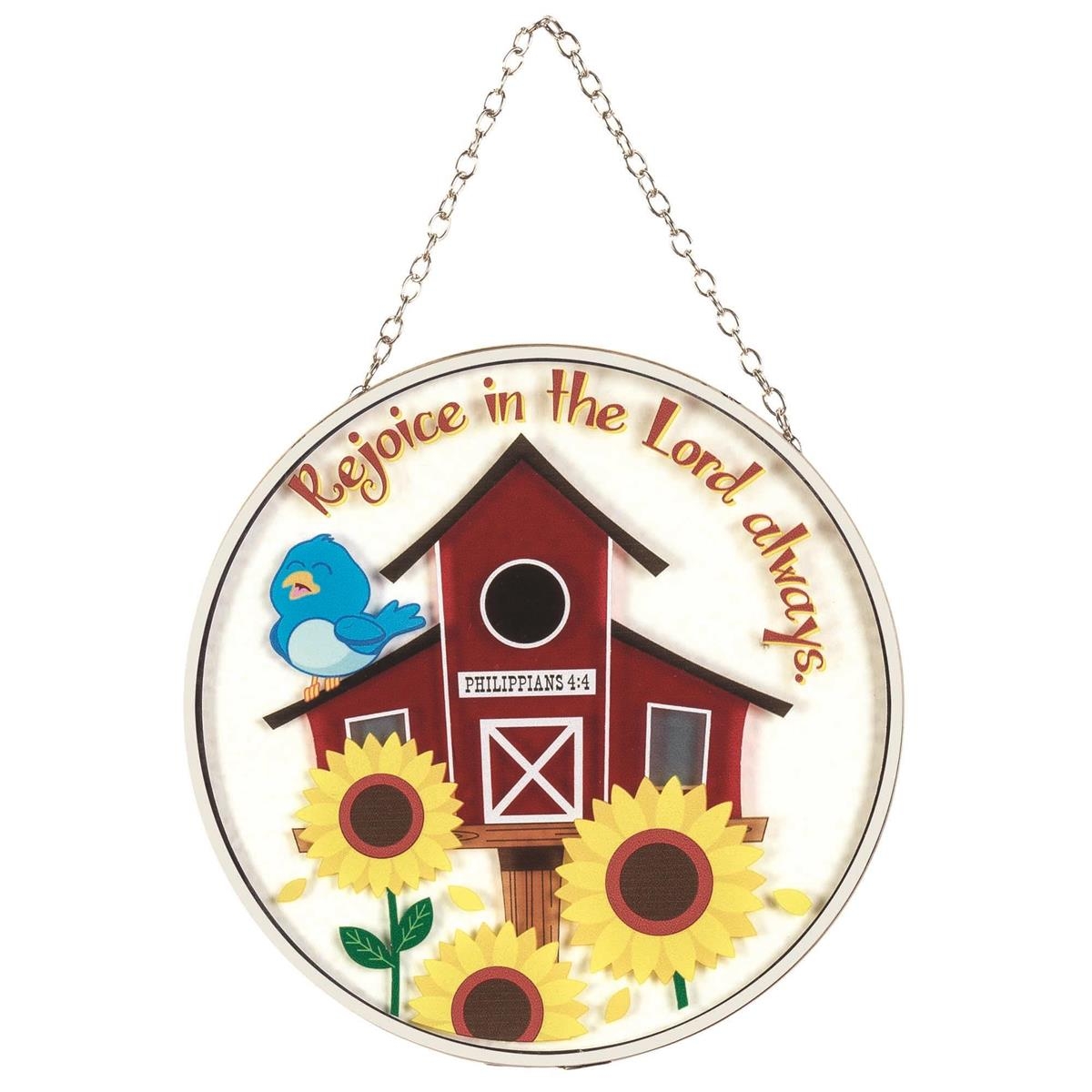 Illuminated by sunlight through your window, the birdhouse and sunflower design on this stained glass style suncatcher will glow with beauty and inspiration. Includes the scripture verse "Rejoice in the Lord always. Philippians 4:4." The clear textured glass 6" disc has silver metal trim and hanging chain. Suction cup is also included.